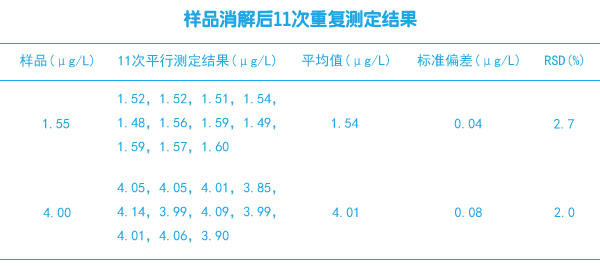 分別對濃度為1.55μg/L的固廢樣品和濃度為4.00μg/L的標準樣品消解后進行重復(fù)測定11次,測定結(jié)果見表1。