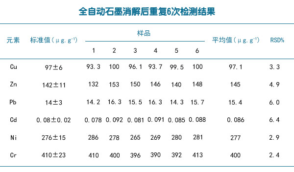 分別稱取0.5g(精確至0.0001g)GBW07407(GSS-7)土壤樣品各6份,用全自動石墨消解儀法對樣品進行消解,然后用進行分析,所得標準土壤樣品的準確度和精密度結果如下表格。