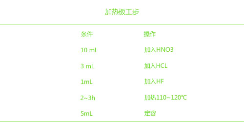 加熱板消解:稱取0.1000g標準土壤樣 品(各3個平行樣)于洗凈的聚四氟乙烯燒杯中,再加 步驟 入10 mL HNO3、3 mL HCL和 1mL HF,置于加熱 板上保持110~120℃恒溫加熱2~3h,趕酸至近干,用2% HNO3 將消解液定容于5mL,離心,等測;此外在土壤樣品 消解的同時,相同的試驗溫度、時間條件下再做3個試劑空白,以消除由于試劑帶來的誤差。