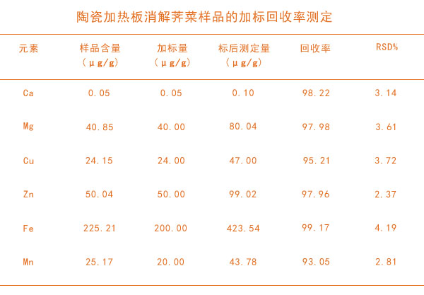 采用陶瓷加熱板消解薺菜測定金屬元素的含量是比較常規的消解設備,陶瓷加熱板具有較大加熱臺面,可以進行大批量前處 理,敞開式消解與遠程的控制,實驗安全,操作簡單。玻璃陶瓷臺面一抹即凈,清潔相當方便,濕法消解體系也比較成熟對薺菜的消解效果較好。