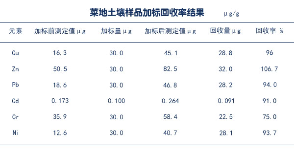 采用電熱板消解方法對菜地土壤進行加標實驗消解分析,每個樣品平行測定3份結果如下表,并進行加標回收率的測定情況(見表回收率測定結果)和實際樣品及標準樣品測定的偏差情況較吻合。