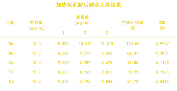 從結(jié)果可以看出消解的方法效果較好。測(cè)定人參中重金屬元素含量時(shí)實(shí)驗(yàn)室陶瓷加熱板消解處理適用。