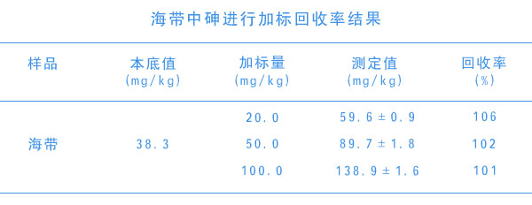 采用加標(biāo)回收和標(biāo)準(zhǔn)物質(zhì)考察方法的準(zhǔn)確性。對(duì)海帶樣品進(jìn)行加標(biāo)回收試驗(yàn),分別加入低、中、高濃度的砷標(biāo)準(zhǔn)溶液,樣品經(jīng)前處理后測(cè)定,兩種藻類中砷的加標(biāo)回收率范圍為96%一109%,結(jié)果下列表。